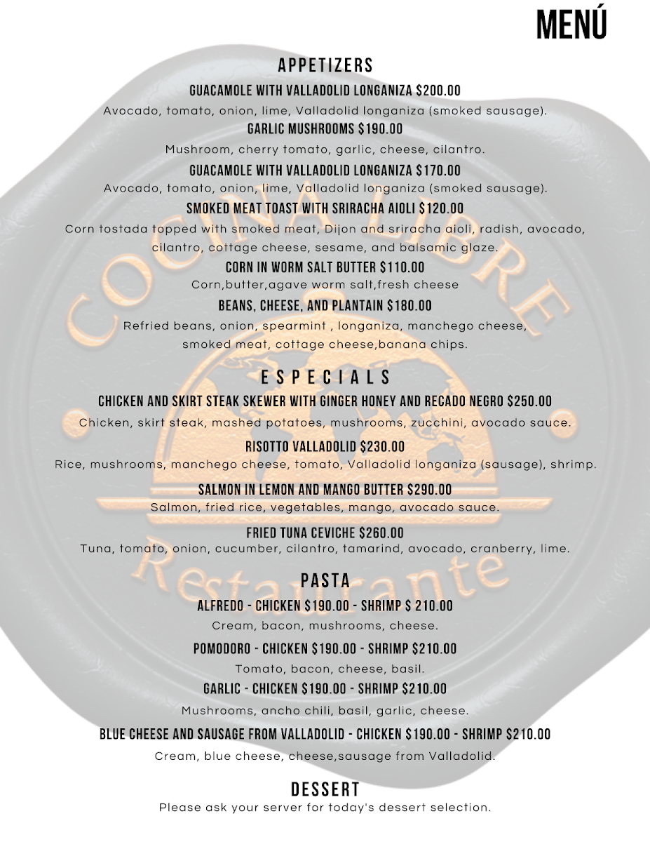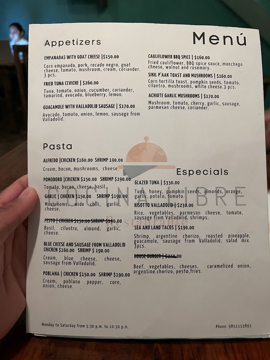 Cocina Libre Restaurante offers a menu that effortlessly balances creativity with local flavors, leaving a lasting impression on the palate. The Blue Cheese Pasta with Shrimps stands out for its rich, indulgent sauce that perfectly complements tender, succulent shrimp, creating a harmony of textures and tastes. Equally remarkable is the Au Chèvre, a dish that showcases fresh, tangy goat cheese paired with carefully selected ingredients, highlighting the kitchen’s flair for sophisticated yet approachable flavors. Seafood lovers will be drawn to the Taco de Camarón En Crema de, where plump shrimp are enveloped in a velvety, flavorful cream, making each bite memorable. For lighter, refreshing options, the Ensalada de Chaya Jamón Serrano Queso Panela Tomate Cherry Y Aceite Balsámico offers a vibrant mix of textures and tastes, combining the earthy chaya leaves, salty Serrano ham, creamy panela cheese, and sweet cherry tomatoes, all tied together with a delicate balsamic drizzle. The menu’s thoughtful balance between indulgent dishes and fresh, inventive salads reflects Cocina Libre Restaurante’s dedication to quality and innovation, leaving diners with both satisfaction and a desire to explore more of what the kitchen has to offer.